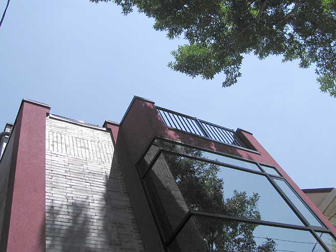 An ambitious owner’s program, a narrow lot, numerous zoning restrictions, and specific construction conditions and limitations were only a fraction of our “to do” list for this 2300 sf home. In addition, the neighbor’s consent and a full range of approval procedures (PAL, COA, OMB) were required before obtaining the building permit. The 2 storey front projection curtain wall with tinted glass creates a feeling of transparency and lightness. The ever changing reflection of the adjacent houses and trees gives dynamic look and contributes to the integration of this home into the existing streetscape. Spacious terraces on the third floor offer nice views and exposure.