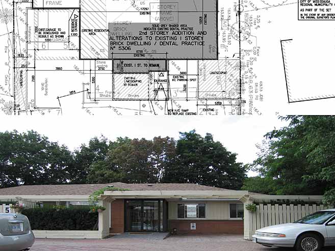 A major renovation and addition to the existing dental clinic and a new second storey residential addition were on the client’s list. We intensively researched for similar developments, checked the zoning regulations, and developed preliminary concept design. A smooth and functional co-existence between the busy dental clinic and the proposed luxurious residence was achieved. Presentation drawings and a site plan study were prepared for discussion with the planning department of the City of Mississauga.